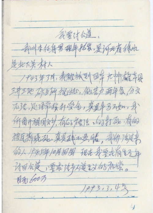21 10 月, 2018 s3078 Share EmailTwitterFacebookGoogle +PinterestTumblrLinkedinVkontakte 信扫描序列号:s3078 写信日期:1993-03-04 写信地址:河北省保定市徐水县 受害日期:1943-03 受害地址:河北省保定市徐水县 写信人:李征舟 受害人:李征舟 类别:劳工(SL) 细节:1943年3月我被抓到日本三井三池矿业所做苦力两年多分文不给还受尽屈辱牛马不如我要在有生之年要求日本赔偿我的损失。备注:信封丢失 我要讨公道 我叫李征舟,男,现年86岁,是河北省徐水县北下关村人。 1943年3月,我被抓到日本九州[熊]本县三井三池矿业所挖煤,做苦力,两年多,分文不给,还经常挨打受气,真是牛马不如,我们离开祖国家乡,有的被活活的打死,有的被瓦斯烧死,真是[惨]不忍睹,我们活过来的人,1945年10月回国,现在我要在有生之年讨回公道,要求给予人道主义的补偿。日元600万。 1993年3月4日 21 10 月, 2018 10000cfj_3o5som 劳工(SL)