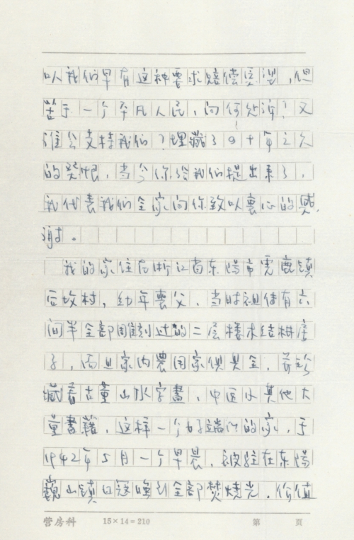 我的家住在浙江省东阳市云鹿镇后坟村,幼年丧父,当时祖传有六间半全部雕刻过的二层楼木结构房子,而且家内农用家[具俱]全,并珍藏着古董山水字画,中医及其他大量书籍,这样一个好端端的家,于1942年5月一个早晨,被驻在东阳巍山镇日寇强行全部焚烧光,价值十二万多元房产,顷刻间变成了一片瓦砾。孤儿寡母,无处[栖]身,无衣缺料悲惨生活,至今回忆起来就寒心。当时依靠诸亲友及做好事善心人帮助下,临时盖了二间简易房临时安身,一直至今已成危房,再不能居住了。