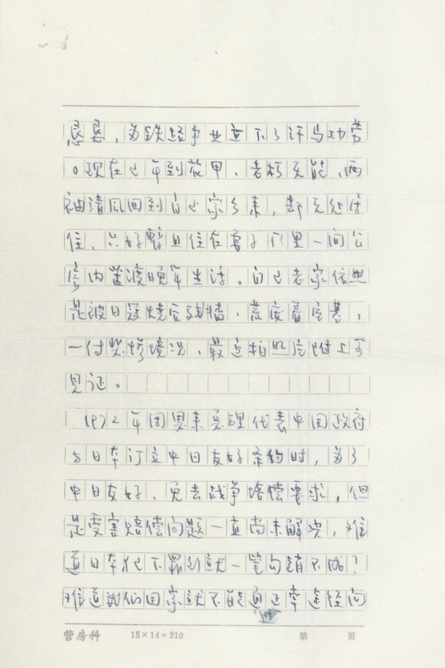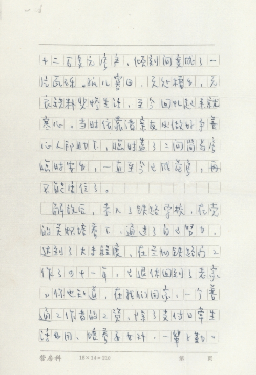 解放后,考入了铁路学校,在党的关怀培养下,通过了自己努力,达到了大专程度,在兰州铁路局工作了四十一年,已退休回到了老家,你也知道,在我们国家,一个普通工作者的工资,除了支付日常生活费用、培养子女外,一辈子勤勤恳恳,为铁路事业立下了汗马功劳。现在已年到花甲,老朽无能,两袖清风回到自己家乡来,却无处居住,只好暂且住在妻子厂里一间公屋内苦渡晚年生活。自己老家依然是被日寇烧后残墙,荒废着屋基,一付悲惨境况,最近拍照片附上可见证。