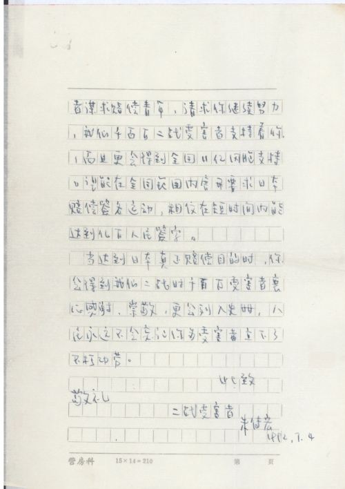 抗战胜利后,日本是战败国,所以我们早有这种要求赔偿愿望,但苦于一个平凡人民,向何处诉?又谁会支持我们?埋藏了四十年之久的哭恨,当今你给我们提出来了,我代表我们全家向你致以衷心的感谢。