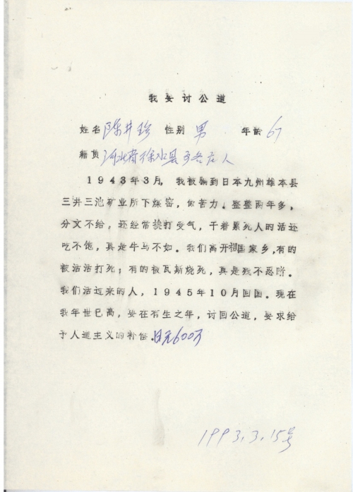 细节:1943年3月我被日军骗到日本在三井三池矿业所挖煤窑做劳工两年多,他们分文不给还经常打骂我们,每天干着累死人的活还吃不饱,有的工友被活活打死,有的被瓦斯烧死。我要在有生之年讨回公道,我要求日本政府给予赔偿。备注:信封丢失
