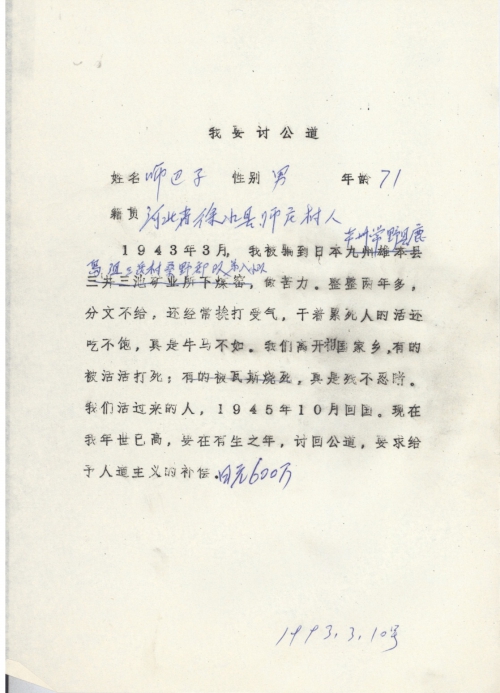 1943年3月,我被骗到日本本州[长]野县鹿岛组三岳村桑野部队第八小队,做苦力。整整两年多,分文不给,还经常挨打受气,干着累死人的活还吃不饱,真是牛马不如。我们离开祖国家乡,有的被活活打死;真是惨不忍睹。我们活过来的人,1945年10月回国。现在我年[事]已高,要在有生之年,讨回公道,要求给予人道主义的补偿。日元600万。