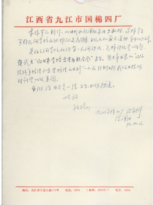 江西九江国棉四厂张闻开呈上
