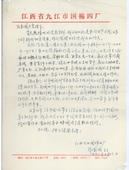 我于七月十二日给您一信,介绍了我父母双亲在第二次世界大战日军侵华期间惨遭受害,父至死,母至残。表示支持您倡导的中国民间要求日本对受害者赔偿。