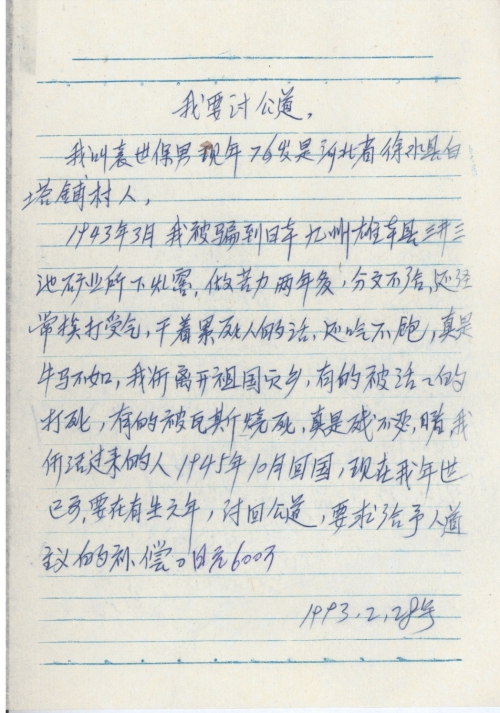 细节:1943年3月我被骗到日本三井三池矿业所下煤窑,两年多分文不给还经常挨打受气甚至有的工友被残忍杀害,我要求日本政府给予人道主义的赔偿。备注:信封丢失