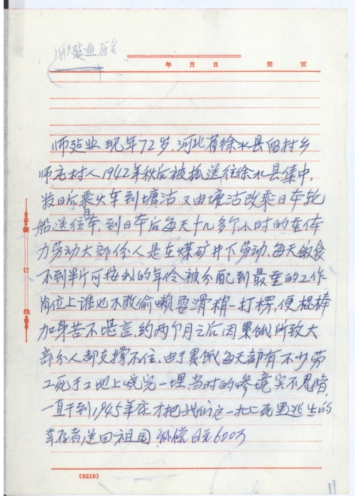 师建业,现年72岁,河北省徐水县留村乡师庄村人,1942年秋后被抓送往徐水县集中,数日后乘火车到塘沽又由塘沽改乘日本轮船送往日本,到日本后每天十几多个小时的重体力劳动,大部份人是在煤矿井下劳动,每天饭食不到半斤,可按我的年[龄]被分配到最重的工作岗位上谁也不敢偷懒耍滑稍一打楞,便棍棒加身苦不堪言。约两个月之后,因累饿所致大部分人都支撑不住,由于累饿每天都有不少劳工死于工地上烧完一埋,当时的惨境实不忍赌,一直干到1945年底才把我们这一批死里逃生的幸存者送回祖国,补偿日元600万。