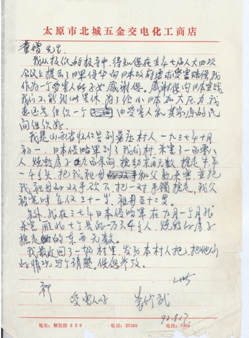 From newspaper reports, I learned that you put forward the proposal at the Fourth Session of the Seventh National People’s Congress last year to demand the Japanese government to pay damage compensation for invasion by Japanese Army , as the child of a victim I want to express my appreciation for you. Thank you for declaring war on Japan, for we cannot take it lying down, in order to give Japan some pressure, I think it’s better to organize a non-governmental organization consisting of victims and their family members.