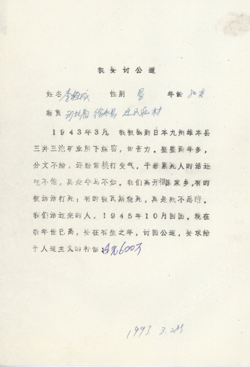 细节:1943年3月我被骗到日本做苦力两年多的时间里分文不给还经常挨打受气过不日子不如牛马。我要求日本政府给予补偿。备注:信封丢失