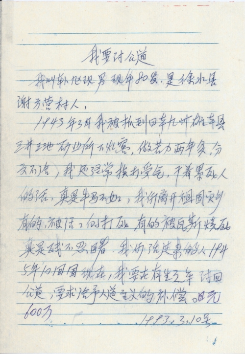 21 10 月, 2018 s3127 Share EmailTwitterFacebookGoogle +PinterestTumblrLinkedinVkontakte 信扫描序列号:s3127 写信日期:1993-03-10 写信地址:河北省保定市徐水县 受害日期:1943-03 受害地址:河北省保定市徐水县 写信人:韩风现 受害人:韩风现 类别:劳工(SL) 细节:1943年3月我被骗到日本做苦力两年多的时间里分文不给还经常挨打受气过不日子不如牛马。我要求日本政府给予补偿。备注:信封丢失 我叫韩风现,男,现年80岁,是徐水县谢方营村人。 1943年3月,我被抓到日本九州[熊]本县三井三池矿业所下煤窑,做苦力两年多,分文没给,我还经常挨打受气,干着累死人的活,真是牛马不如。我们离开祖国家乡,有的被活活的打死,有的被瓦斯烧死,真是[惨]不忍睹。我们活过来的人,1945年10月回国。现在,我要在有生之年,讨回公道,要求给予人道主义的赔偿。日元600万。 1993年3月10日 21 10 月, 2018 10000cfj_3o5som 劳工(SL)