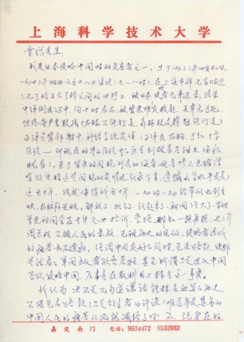 我是日本侵略中国时的受害者之一,生于一九三三年四月二十二日,一九四三年阴历六月二十八日傍晚(七~八时),在上海市郊七宝附近七号桥与六号桥之间的田野上,被日本侵略者无辜追杀,结果中弹倒在河中,约十时左右,被背米难友救起,虽幸免于死但终身严重致残(左腿不能行走,靠拐杖支撑勉强行走)子弹是背部射中,神经系统受伤,(子弹在右胸,于红十字医院——即现在的华山医院中的医生划破表层钳出,伤痕犹存)。至于背米的同胞所受的侮辱迫害惨不忍睹。(曾有愿望将这些同胞的受难史记录下来,遗憾文学水平太差)这五十年,残废伴随我五十年,一切的一切经常似电影重映,在脑际显现。解放了,独立了,站起来了,祖国强大了,当时曾想祖国会为中华儿女控诉,索赔。[哪]知一拖再拖,七二年周总理不顾人民的意愿,无视历史的见证,侵略者造成的痛苦和后遗症,强调中日友好的同时,免去赔偿,使那些活着的军国主义者欣喜若狂,甚至所谓只是进入中国,否认侵略中国,后来竟在教科书上抹去这一事实。