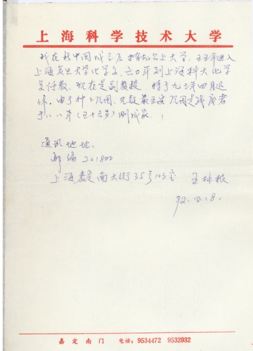 我在新中国成立之后才有机会上大学,五五年进入上海复旦大学化学系,六零年到上海科大化学系任教,现在是副教授,将于九三年四月退休。由于种种原因,无疑最主要原因是残于者八八年(五十六岁)刚成家。