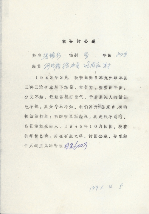 1943年3月,我被骗到日本九州[熊]本县三井三池矿业所下煤窑,做苦力。整整两年多,分文不给,还经常挨打受气,干着累死人的活还吃不饱,真是牛马不如,我们离开祖国家乡,有的被活活打死;有的被瓦斯烧死,真是惨不忍睹。我们活过来的人,1945年10月回国。现在我年[事]已高,要在有生之年,讨回公道,要求给予人道主义的补偿。日元600万。