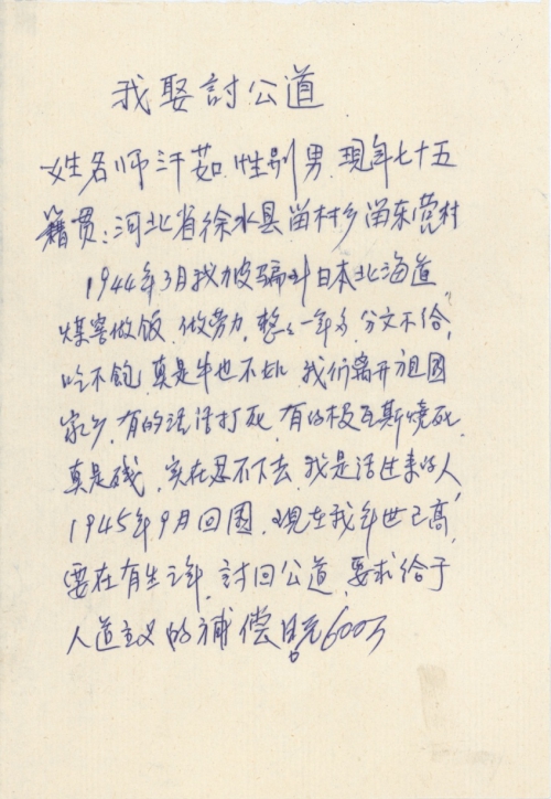 1944年3月我被骗到日本北海道煤窖做饭,做劳力。整整一年多,分文不给,吃不饱,真是牛也不如,我们离开祖国家乡,有的活活打死,有的[被]瓦斯烧死。真是残,实在忍不下去。我是活过来的人,1945年9月回国,现在我年[事]已高,要在有生之年,讨回公道,要求给予人道主义的补偿。日元600万。
