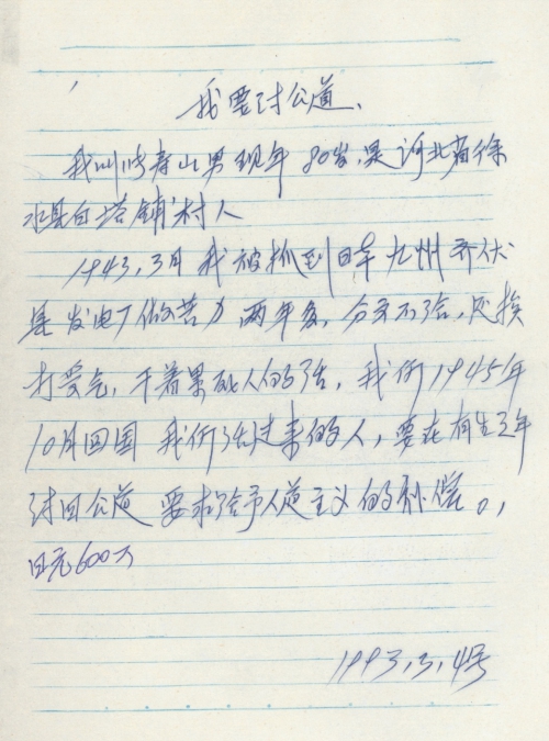21 10 月, 2018 s3135 Share EmailTwitterFacebookGoogle +PinterestTumblrLinkedinVkontakte 信扫描序列号:s3135 写信日期:1993-03-04 写信地址:河北省保定市徐水县 受害日期:1943-03 受害地址:河北省保定市徐水县 写信人:张寿山 受害人:张寿山 类别:劳工(SL) 细节:1943年我被抓到日本,在日本的发电厂做苦力两年多分文不给还挨打受气干着累死人的活,因此我要求日本政府赔偿我。备注:信封丢失 我要讨公道 我叫张寿山,男,现年80岁,是河北省徐水县白塔铺村人。 1943.3月我被抓到日本九州齐伏县发电厂做劳力两年多,分文不给,还挨打受气,干着累死人的活,我们1945年10月回国,我们活过来的人,要在有生之年讨回公道,要求给予人道主义的补偿。日元600万。 1993年3月4日 21 10 月, 2018 10000cfj_3o5som 劳工(SL)