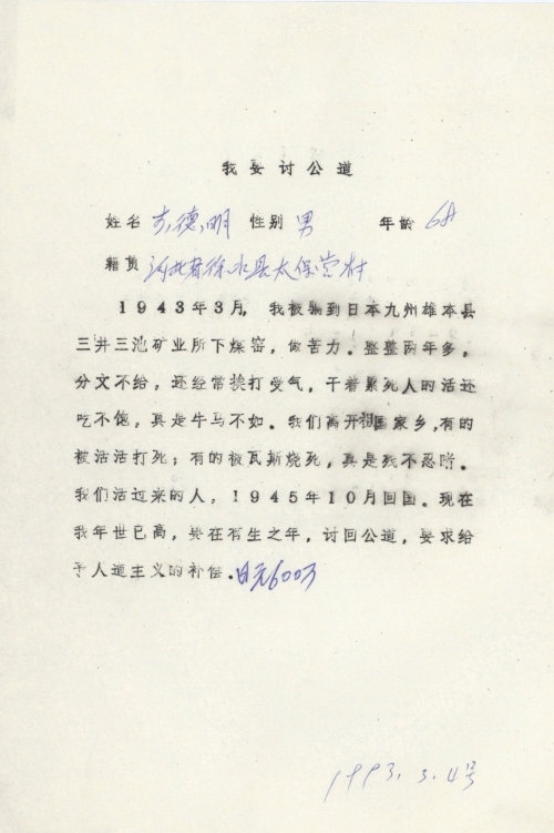 细节:1943年3月我被日军骗到日本在三井三池矿业所挖煤窑做劳工两年多,他们分文不给还经常打骂我们,每天干着累死人的活还吃不饱,有的中国劳工被活活打死,有的被瓦斯烧死。我要在有生之年讨回公道,我要求日本政府给予赔偿。备注:信封丢失