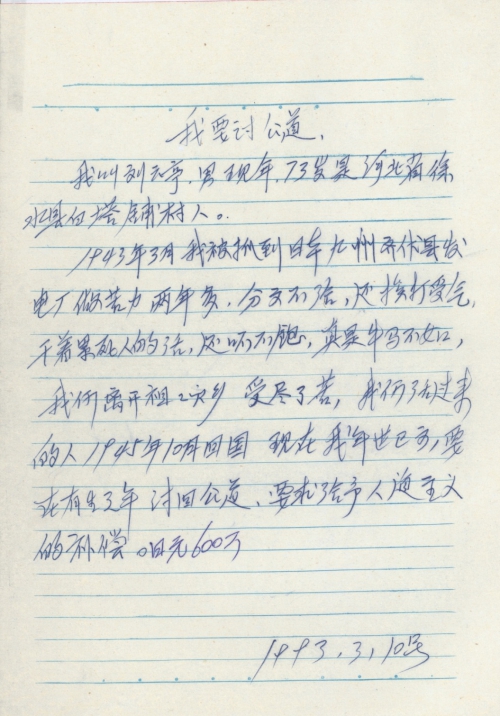 21 10 月, 2018 s3143 Share EmailTwitterFacebookGoogle +PinterestTumblrLinkedinVkontakte 信扫描序列号:s3143 写信日期:1993-03-10 写信地址:河北省保定市徐水县 受害日期:1943-03 受害地址:河北省保定市徐水县 写信人:刘云亭 受害人:刘云亭 类别:劳工(SL) 细节:1943年我被抓到日本,在日本的发电厂做苦力两年多分文不给还挨打受气干着累死人的活,因此我要求日本政府赔偿我。备注:信封丢失 我要讨公道 我叫刘云亭,男,现年73岁,是河北省徐水县白塔铺村人。 1943年3月,我被抓到日本九州齐伏县发电厂做苦力两年多,分文不给,还挨打受气,干着累死人的活,还吃不饱,真是牛马不如,我们离开祖国家乡,受尽了苦,我们活过来的人,1945年10月回国,现在我年[事]已高,要在有生之年,讨回公道,要求给予人道主义的补偿。日元600万。 1993年3月10日 21 10 月, 2018 10000cfj_3o5som 劳工(SL)