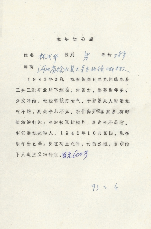 细节:1943年3月我被骗到日本三井三池矿业所做苦力两年多分文不给受尽折辱,我要求日本政府给予赔偿。备注:信封丢失