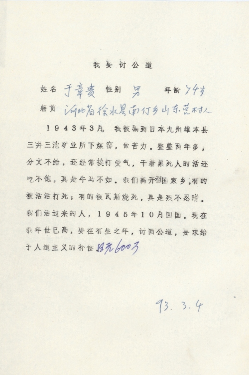 细节:1943年3月我被日军骗到日本做苦力,干的牛马活还吃不饱经常挨打受气甚至有些人被日寇活活打死和烧死。现我要求日方赔偿损失。备注:信封丢失