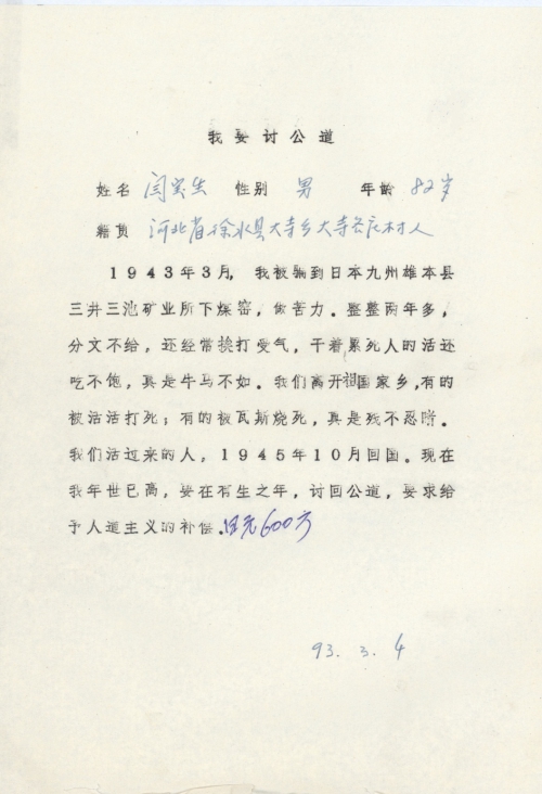 1943年3月,我被骗到日本九州[熊]本县三井三池矿业所下煤窑,做苦力。整整两年多,分文不给,还经常挨打受气,干着累死人的活还吃不饱,真是牛马不如。我们离开祖国家乡,有的被活活打死;有的被瓦斯烧死,真是惨不忍睹。我们活过来的人,1945年10月回国。现在我年[事]已高,要在有生之年,讨回公道,要求给予人道主义的补偿。日元600万。