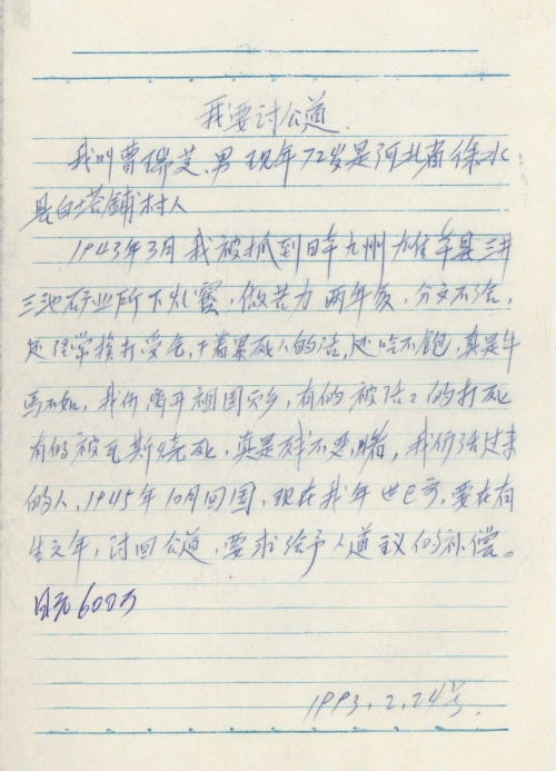 细节:1943年3月我被抓到日本三井三池矿业所下煤窑,两年多分文不给还经常挨打受气甚至有的工友被残忍杀害,我要求日本政府给予人道主义的赔偿。备注:信封丢失