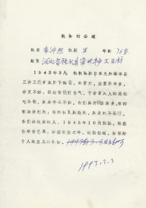 细节:1942年秋后我被押送到达日本后在煤矿当劳工,每天吃不饱还干最重的工作如果偷懒就是挨打几乎每天都有不少劳工死亡我是这一批的幸存者。我要求日本政府赔偿。备注:信封丢失