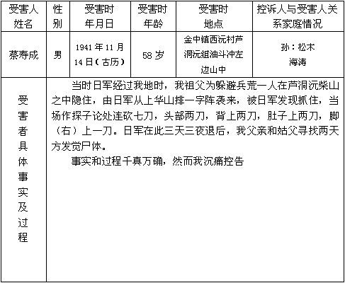 我祖父蔡寿成家住湖南省长沙县金井乡溪源村岺脚里村民组,于民国三十年,日军侵入我国时期,十一月十四日,日军由我地经过,当时我地方百姓都为躲避兵荒,直向本村芦洞沅组油斗冲深山之中隐身。由于日军从上华山一带排一字阵向我地袭来,当时祖父一人单躲一处,由于心慌意乱,被其发现抓住,当场连砍七刀,虽山上目睹者多,但是都无能为力挽救,当时有一下证明人: