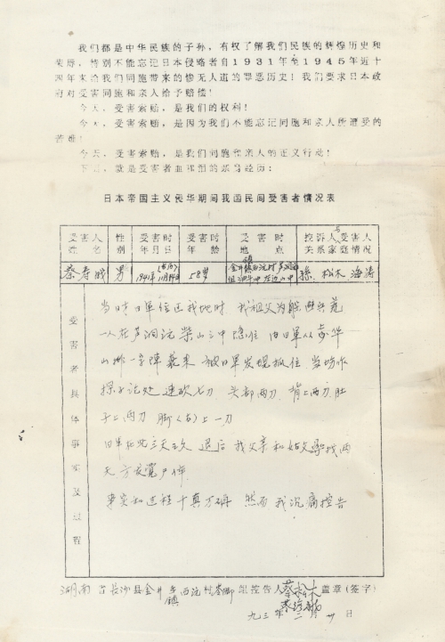 今寄去《长沙县文史资料》一本,以后将再寄几本去。并寄去签名表十张,受害者控告表及证明人材料共九份,93年2月从武汉寄去的签名表及受害人表想早已收到。