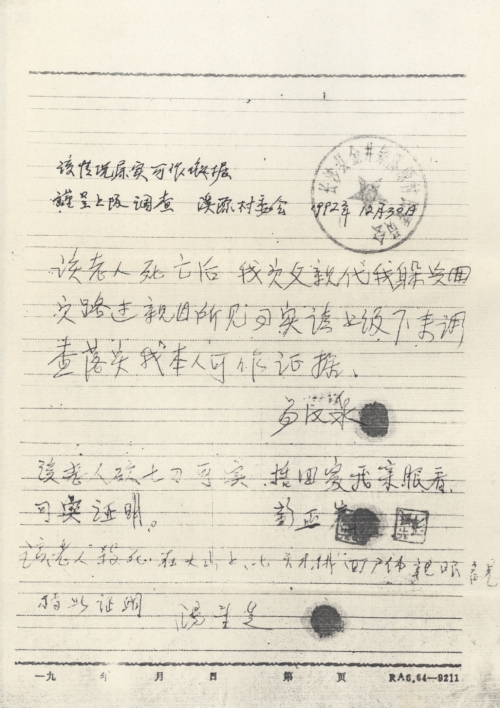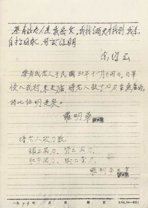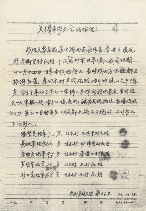 蔡寿成老人于民国30年十一月十四日。日军侵入我村,来势猛将老人杀了七刀,并无虚伪。特此证明事实。