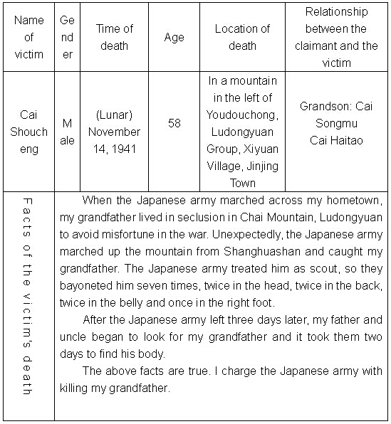 My grandfather Cai Shoucheng lived in Lingjiaoli Group, Xiyuan Village, Jinjing Town, Changsha County, Hunan Province. On November 14 in the 30th year of the Republic of China when the Japanese army marched across my hometown, the villagers hid in the mountain in Youdouchong, Ludongyuan Group of my village to avoid misfortune. Unfortunately, the Japanese army marched up the mountain from Shanghuashan and found my grandfather who became distraught as he was hiding alone. My grandfather was bayoneted seven times. Although many villagers witnessed the tragedy, they were unable to save him. The witnesses include: