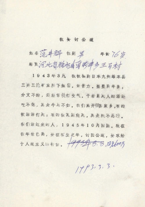 细节:1943年3月我被骗到日本做苦力两年多的时间里分文不给还经常挨打受气过不日子不如牛马。我要求日本政府给予补偿。备注:信封丢失