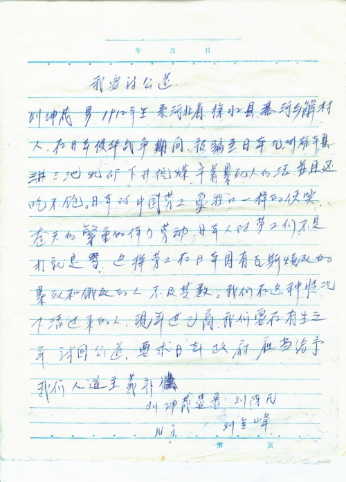 刘坤茂,南,1912年生,系河北省徐水县瀑河乡解村人,在日本侵华战争期间,被骗至日本九州[熊]本县三井三池煤矿下井挖煤,干着累死人的活,并且还吃不饱,日本的中国劳工像牲口一样的使唤,整天的繁重的体力劳动,日本人对劳工们不是打就是骂,这样劳工在日本国有瓦斯烧死的累死和饿死的人不计其数,我们在这种情况下活过来的人,现年[事]已高,我们要在有生之年,讨回公道,要求日本政府应当给予我们人道主义补偿。