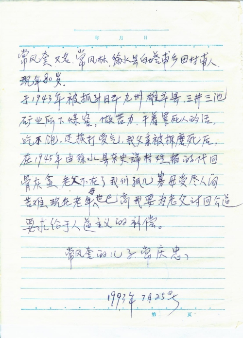 于1943年被抓到日本九州[熊]本县三井三池矿业所下煤窑,做苦力,干着累死人的活,吃不饱,还挨打受气,我父亲被折磨死后,在1945年由徐水县东史端村姓柏的[带]回骨灰盒,老父不在了我们孤儿寡母受尽人间苦难,现在老母年[事]已高,我要为老父讨回公道,要求给[予]人道主义的补偿。
