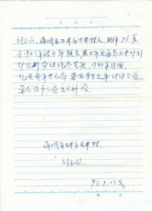 于1943年被日本抓去,在日本北海岛三井炉别矿业所劳动吃尽苦头。1945年回国。现在我年[事]已高,要在有生之年讨回公道,要求给予人道主义补偿。