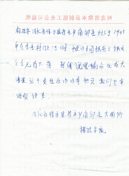 杨造尔,河北省徐水县崔庄乡南邵庄村人,于1943年在李庄村做活时,被日本国抓劳工抓去,至今无有下落,据传说装输后死在大海里,这个责任应由日本担负,我们要求赔偿损失。