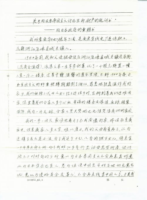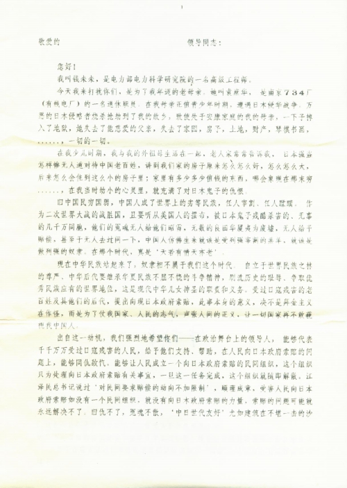 出自这一动机,我们强烈地希望你们——在政治舞台上的领导人,能够代表千千万万受过日寇残害的人民,给予他们支持、帮助,在人民向日本政府索赔的问题上,能够同仇敌忾。能够让人民成立一个向日本政府索赔的民间组织,这个组织只为处理向日本政府索赔有关事宜,一旦这一任务完成,这个组织就随即解散。江泽民总书记说过‘对民间要求赔偿的动向不加限制’,顺理成章,受害人民向日本政府索赔如没有一个民间组织,就没有向日本政府索赔的力量,索赔的问题可能就永远解决不了。旧仇不了,冤魂不散,‘中日世代友好’尤如建筑在不堪一击的沙滩上。