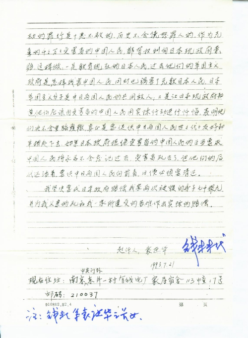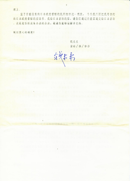 We insist on all victims in countries suffered by Japanese millitarism have the right to ask for compensation from Japanese goverment. We know you are striving for peace and friendship between Japanese and Chinese.In order to set truly friendship between Japanese and Chinese from generation to generation, Japanese goverment has to adopt a responsible attitude to solve the legacy of the aggressive war with great efforts.