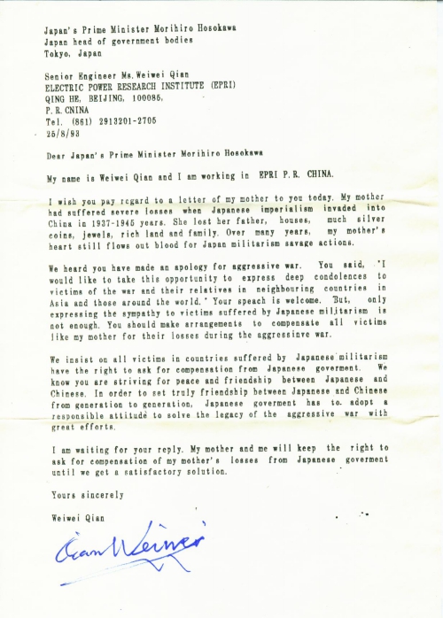 We heard you have made an apology for aggressive war. You said,”I would like to take this opportunity to express deep condolences to victims of the war and their relatives in neighbouring countries in Asia and those around the world.”Your speach is welcome. But, only expressing the sympathy to victims suffered by Japanese militarism is not enough.You should make arrangements to compensate all victims like my mother for their losses during the aggressinve war.