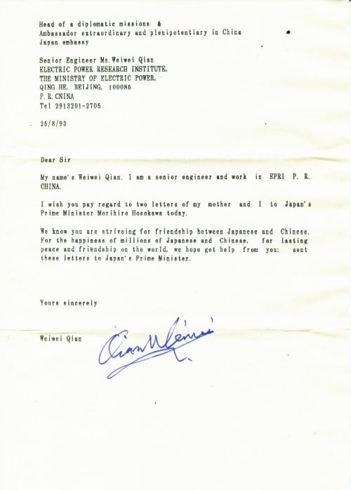 We know you are striveing for friendship between Japanese and Chinese. For the happiness of millions of Japanese and Chinese, for lasting peace and friendship on the world, we hope get help from you: sent these letters to Japan’s Prime Minister.