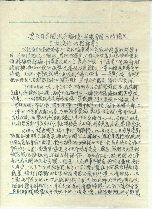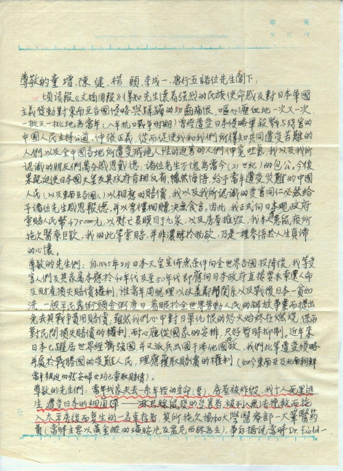 尊敬的先生们:当年我家失去一条年轻的生命(妻),房屋被炸毁,我个人死里逃生遭受日本的细菌弹——淋巴腺鼠疫的受害者,被列入无法挽救而拖入太平房后而复生的一名幸存者,其所拖欠协和大学医疗部一大笔医药费(当时主要以黄金般的磺胺片及盘尼西林为主),事后据说当时Dr.Fielding菲尔丁博士把大剂量药物调成迷糊状灌服,其用费之大,可见一般。综上所述,我正式向日本国现政府提出索赔以上三笔损失费用475000元人民币(或约52800美元)以慰亡妻在天之灵以及弥补我家(老家现今尚存三兄弟三姊妹)及我个人当年所遭受一切苦难;我的此等索赔,并非完全浓醇于物欲,乃是一种参悟人生之真谛的心怀。尊敬的先生们:据报刊称通过您们高层恩人的积极努力,我国七届人大已将此项提案列入会议正式议程中,并向日本驻我国使馆提出交涉,相信民间损失的赔偿是会实现的,日本现政府本着人道主义原则给予无代价支付的。万一无视及拒绝接受国际法公认准则,日本天皇裕仁当年的无条件投降又意味着什么呢?果若,我等于广西,福建等地发起受害者的签名运动,并呈送先生们收集全国各地签名书,上交海牙国际法庭研究判决,是否有当,不胜感德为荷。