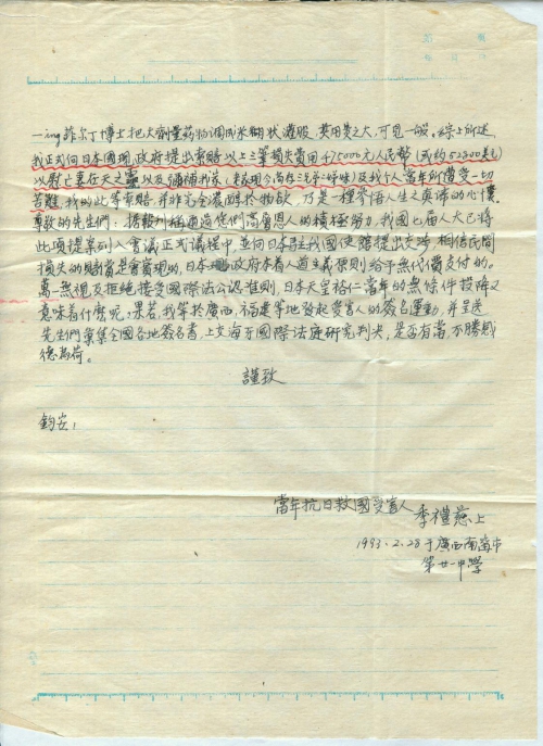 尊敬的先生们:自1945年8月日本天皇宣布无条件向全世界各国投降后,我等受害人们及其家属本应于40年代及至50年代即应向日本政府直接要求索还人命及财产损失赔偿权利;惟当年周总理以改善邻邦关系以及战后日本一贫如洗,一般平民靠街头舍粥度日,着眼于全世界劳动人民的解放事业而提出免去其战争费用赔偿;虽然我们心中对日军仇恨的怒火始终在燃烧,保留对民间损失赔偿的权利,耐心听从国家的安排,只好暂时抑制。近年来日本已跃居世界经济强国,并又派兵出国干涉他国内政,我们此等遭受侵略并处于战胜国的受难人民,理应获取赔偿的权利(如今东南亚及北南朝鲜当年被迫的慰安妇女均已索取赔偿)。