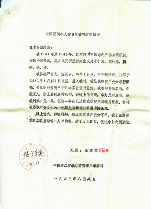 中国民间个人被日军受害者索赔书