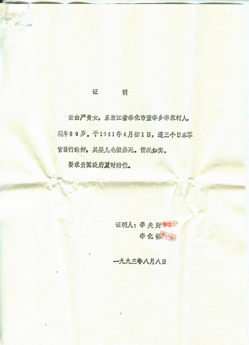 兹由严贵女,系浙江省奉化市董李乡李家村人,现年89岁。于1941年4月初1日,遭三个日本军官强行轮奸,其婴儿也被杀死。情况如实。