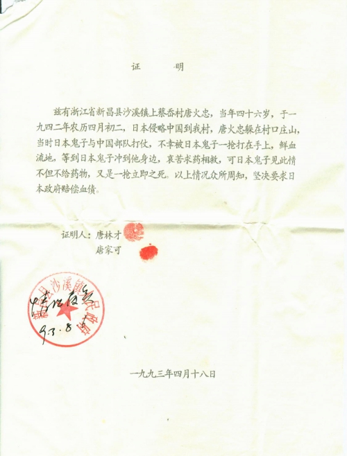 兹有浙江省新昌县沙溪镇上蔡岙村唐火忠,当年四十六岁,于一九四二年农历四月初二,日本侵略中国到我村,唐火忠躲在村口庄山,当时日本鬼子与中国部队打仗,不幸被日本鬼子一枪打在手上,鲜血流地,等到日本鬼子冲到他身边,哀苦求药相救,可日本鬼子见此情不但不给药物,又是一[枪]立即[致]死。以上情况众所周知,坚决要求日本政府赔偿血债。