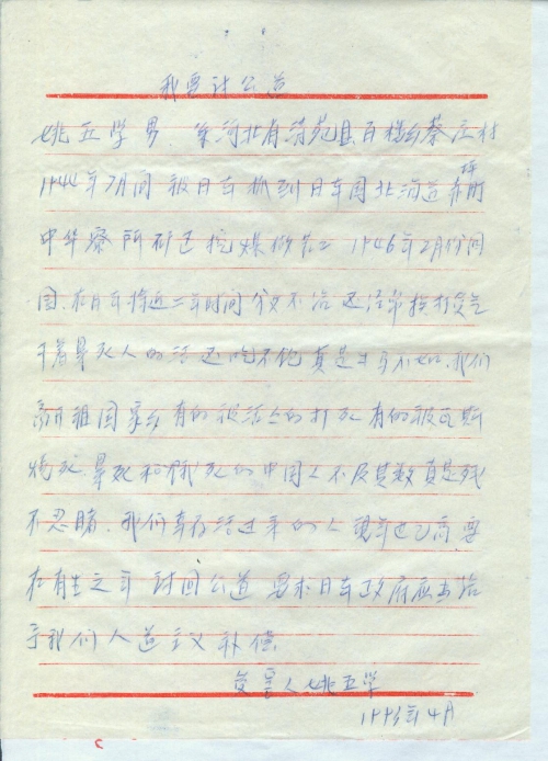 细节:姚五学是河北省清苑县人在1944年被抓到日本北海道做劳工,1946年才回国,要求日本赔偿。备注:信封丢失