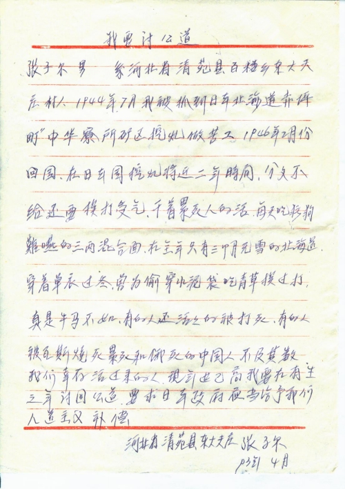 1944年7月我被抓到日本北海道赤坪町中华寮所矿区挖煤做苦工,1946年2月份回国,在日本国挖煤将近二年时间,分文不给,还挨打受气,干着累死人的活,每天吃猪狗难[咽]的三两混合面,在全年只有三个月无雪的北海道,穿着单衣过冬,曾为偷穿水泥袋吃青草挨过打,真是牛马不如,有的人还活活的被打死,有的人被瓦斯烧死,累死和饿死的中国不[计]其数,我们幸存活过来的人,现年[事]已高,我要在有生之年讨回公道,要求日本政府应当给予我们人道主义补偿。