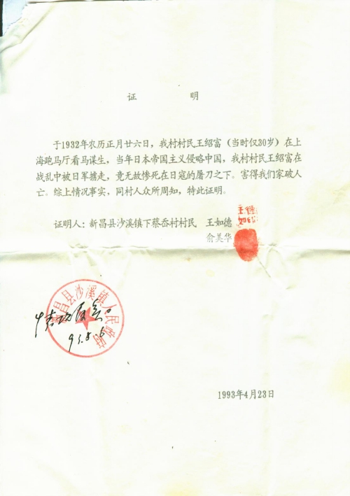 21 10 月, 2018 s3294 Share EmailTwitterFacebookGoogle +PinterestTumblrLinkedinVkontakte 信扫描序列号:s3294 写信日期:1993-04-23 写信地址:浙江省绍兴市新昌县 受害日期:1932 受害地址:上海市 写信人:王如德、俞美华 受害人:王绍富 类别:谋杀(MU) 细节:1932年王绍富在上海看马谋生,被日军抓走,惨死在日军刀下,要求日本赔偿。信中有沙溪镇人民政府的盖章证明。备注:信封丢失 证明 于1932年农历正月二十六日,我村村民王绍富(当时仅30岁)在上海跑马厅看马谋生,当年日本帝国主义侵略中国,我村村民王绍富在战乱中被日军掳走,竟无故惨死在日寇的屠刀之下。害得我们家破人亡。综上情况事实,同村人众所周知,特此证明。 证明人:新昌县沙溪镇下蔡岙村村民 王如德(人名章) 俞美华(手印) 情况属实 93.8.6 新昌县沙溪镇人民政府(政府章) 1993年4月23日 21 10 月, 2018 10000cfj_3o5som 谋杀(MU)