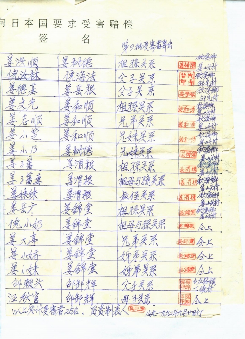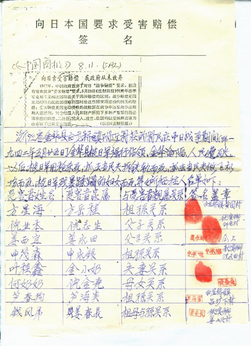 细节:寄来多名受害者索赔资料,其中有方星海、姜西宜被杀害;芦春拘被日军抓去拆铁轨,因病干不动就被打死;姜老顺、姜小芝等感染细菌死亡;倪小奶被日军强奸后枪杀等情况。备注:信封丢失