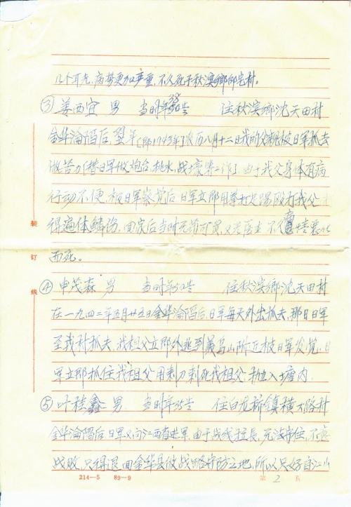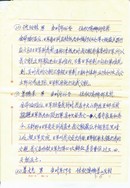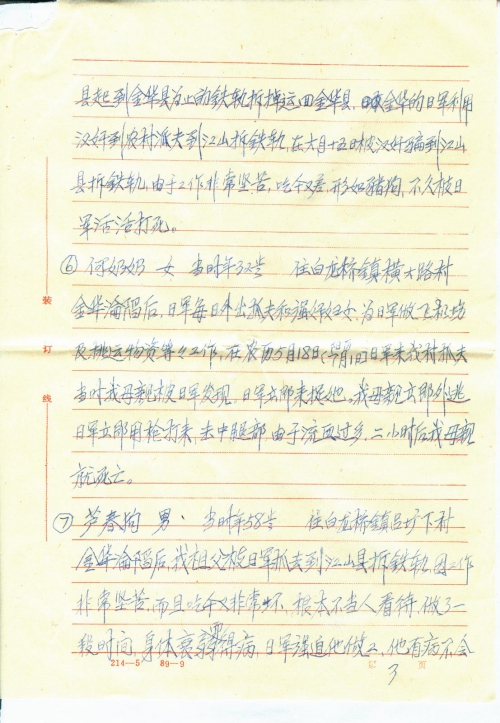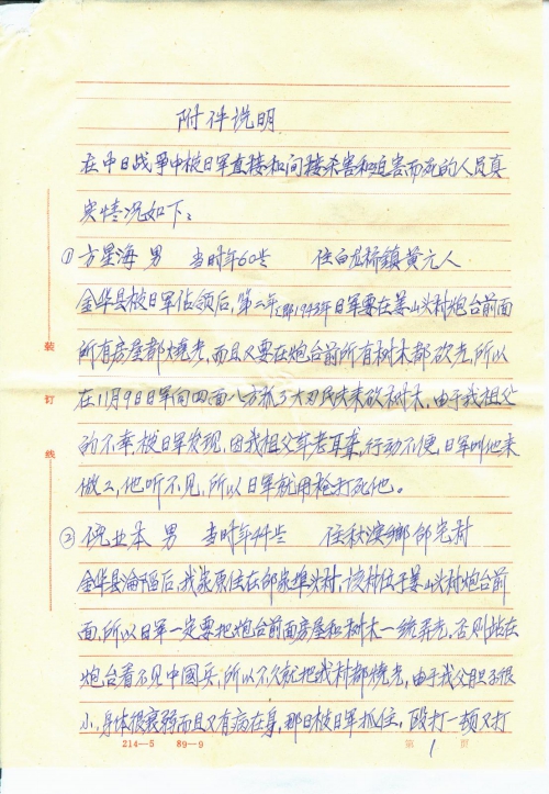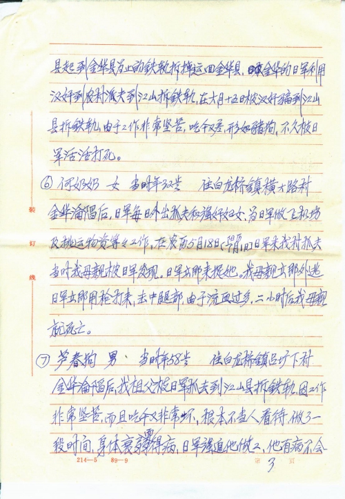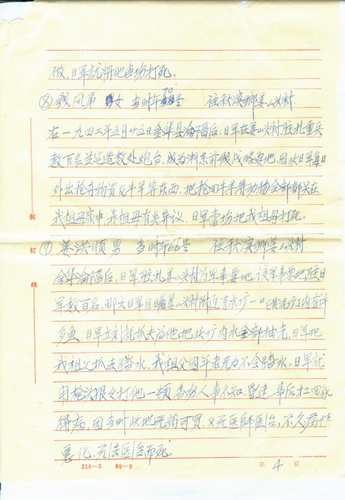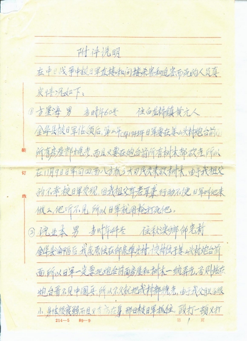 金华沦陷后,日军每日到农村抓夫和强奸妇女等等强盗式罪行,在六月五日,日军到我村[高桥]来抓夫时,我父亲非常害怕日军,所以我父亲立即躲进稻草堆内,不意日军用刺刀向稻草堆乱刺,其[实]我的父亲不幸被日军刺刀触中体部,血流如注,我父立即向外逃跑,日军就用枪打死我父亲。