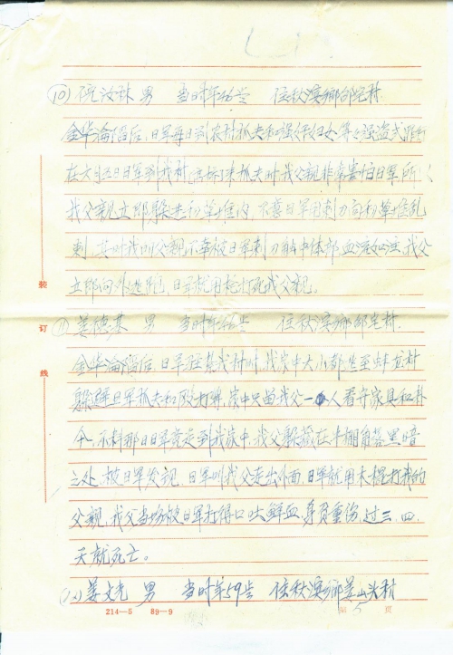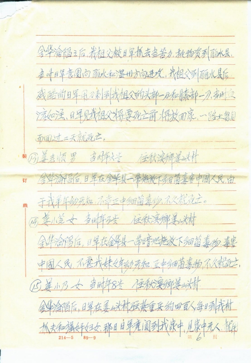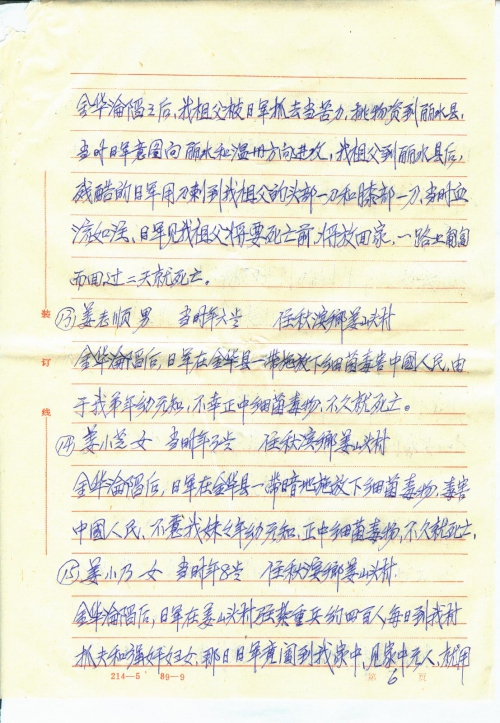 金华沦陷后,驻扎在姜山头村日军,每日外出抓夫及强奸妇女等等,我的哥哥见到日军如此凶[悍],心中非常害怕,不意我的哥哥碰日军,给日军惊吓一下,回家得病,医治无效而死。