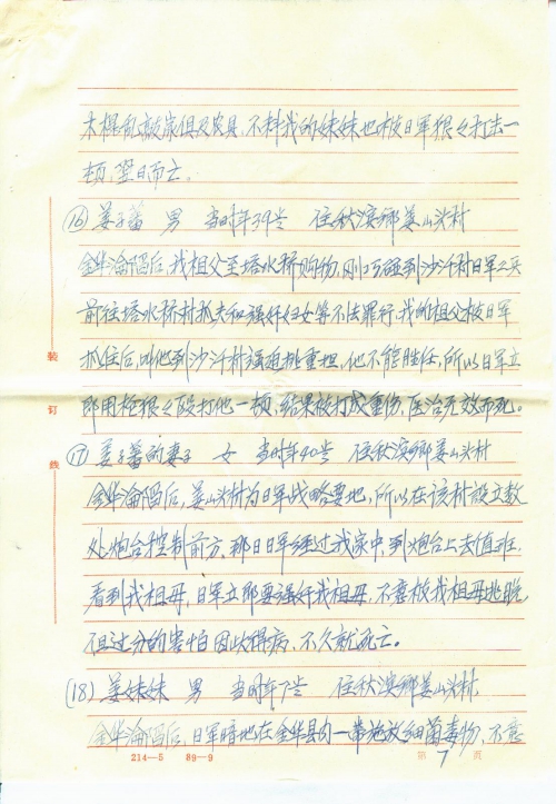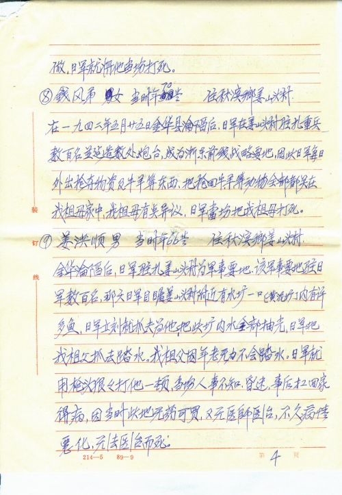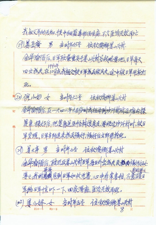 金华沦陷后,日军在姜山头村驻扎重兵约四百人,每日到我村抓夫和强奸妇女,那日日军竟闯到我家中,见家中无人,就用木棍乱敲家具及农具,不料我的妹妹也被日军狠狠打击一顿,翌日而亡。